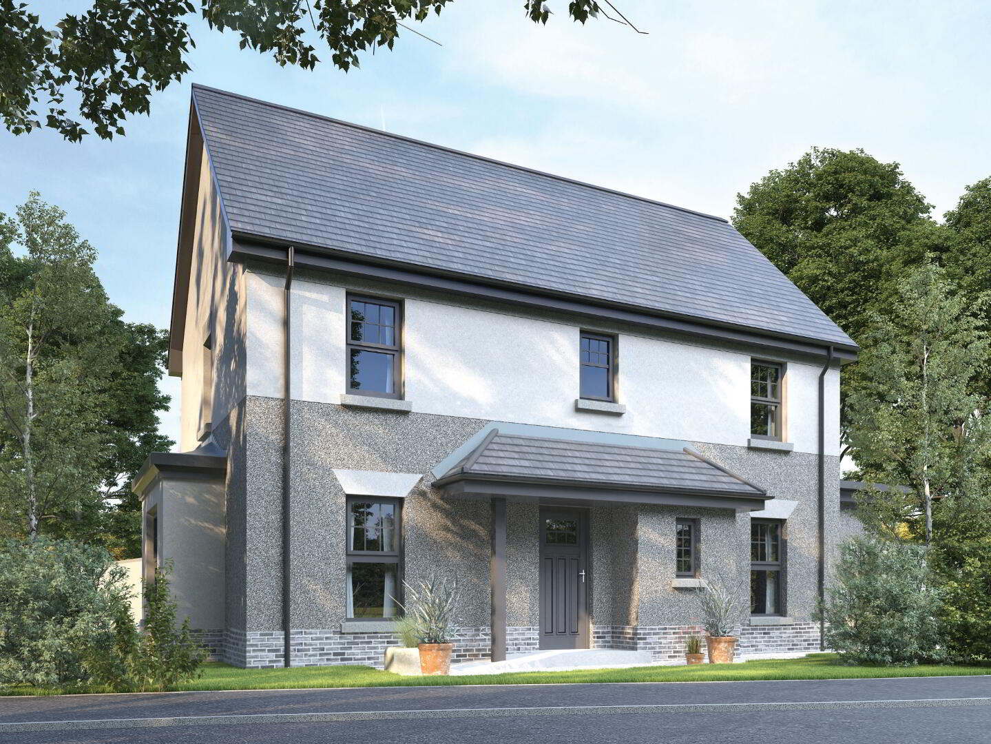 Walls are of traditional, tried and tested cavity construction. Brick and/or plaster render are used for the external finish topped by uPVC square edge fascia, barge and soffit. External timber features are painted to match where applicable. The roof will have a grey coloured, flat concrete tile crowned by a dry fixed ridge tile. uPVC hexagonal guttering with square uPVC downpipes compliment the external trim.